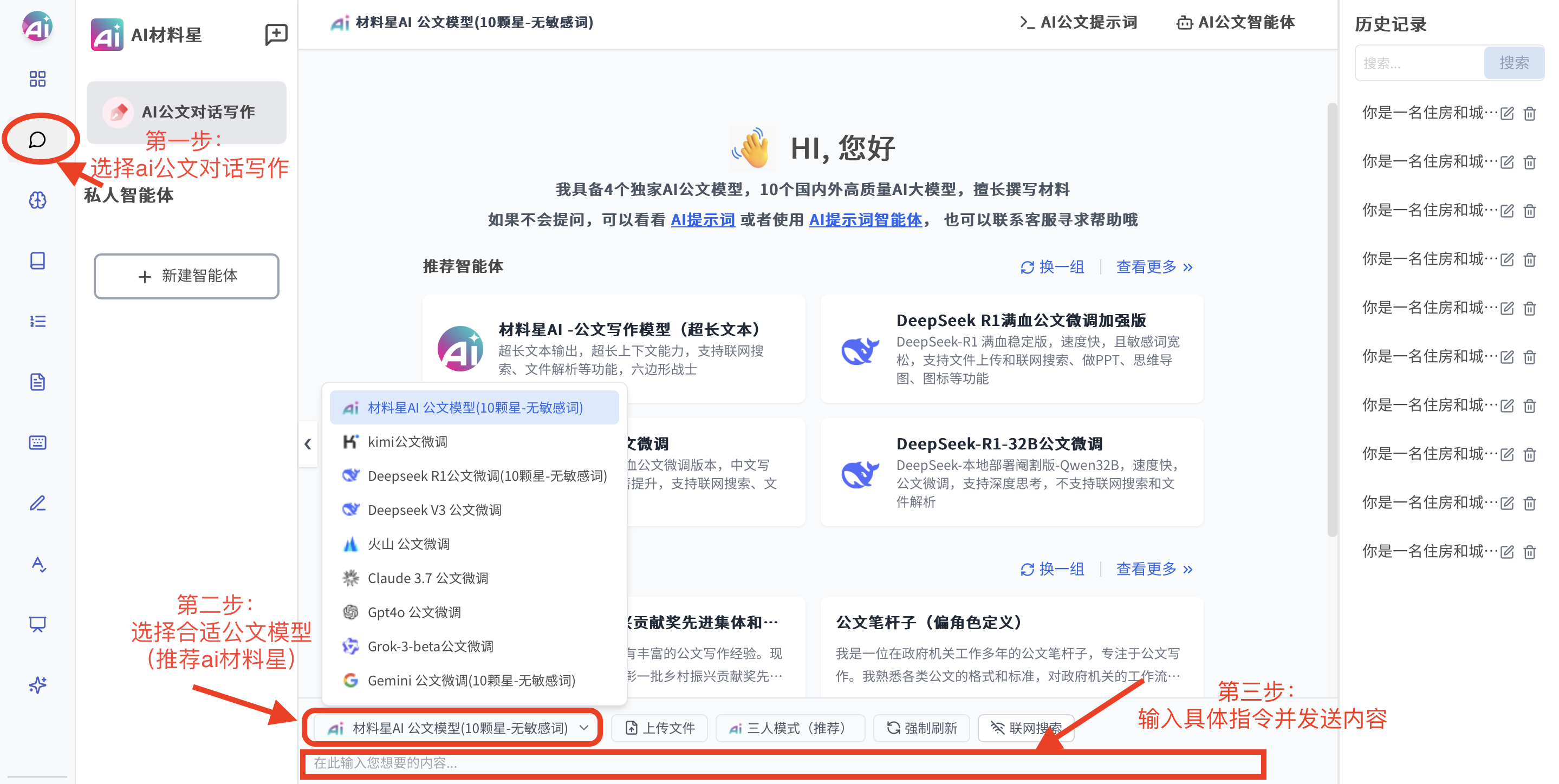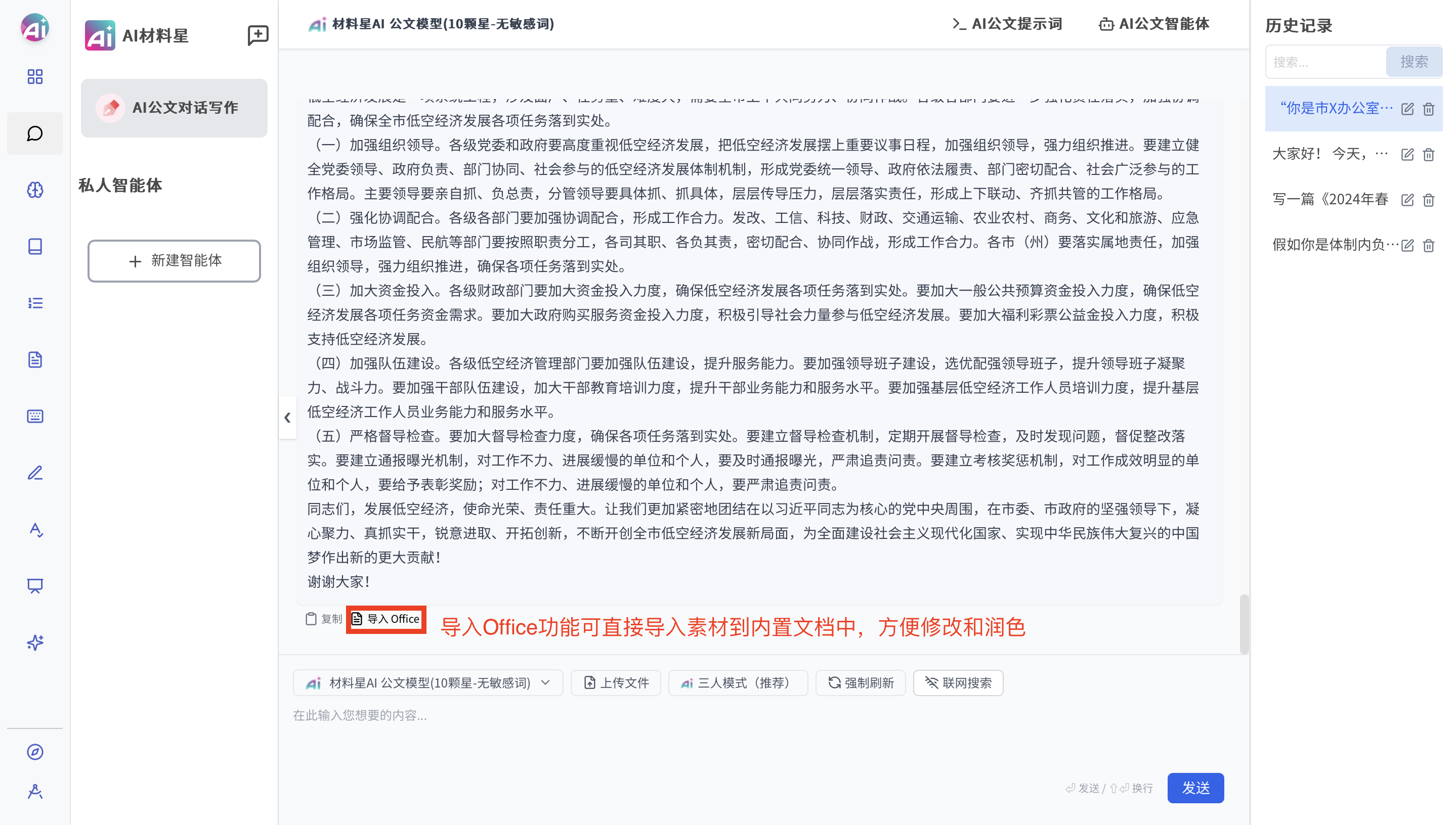 2)首页上选择公文对话写作;选择合适公文模版;输入上述具体指令并发送内容。