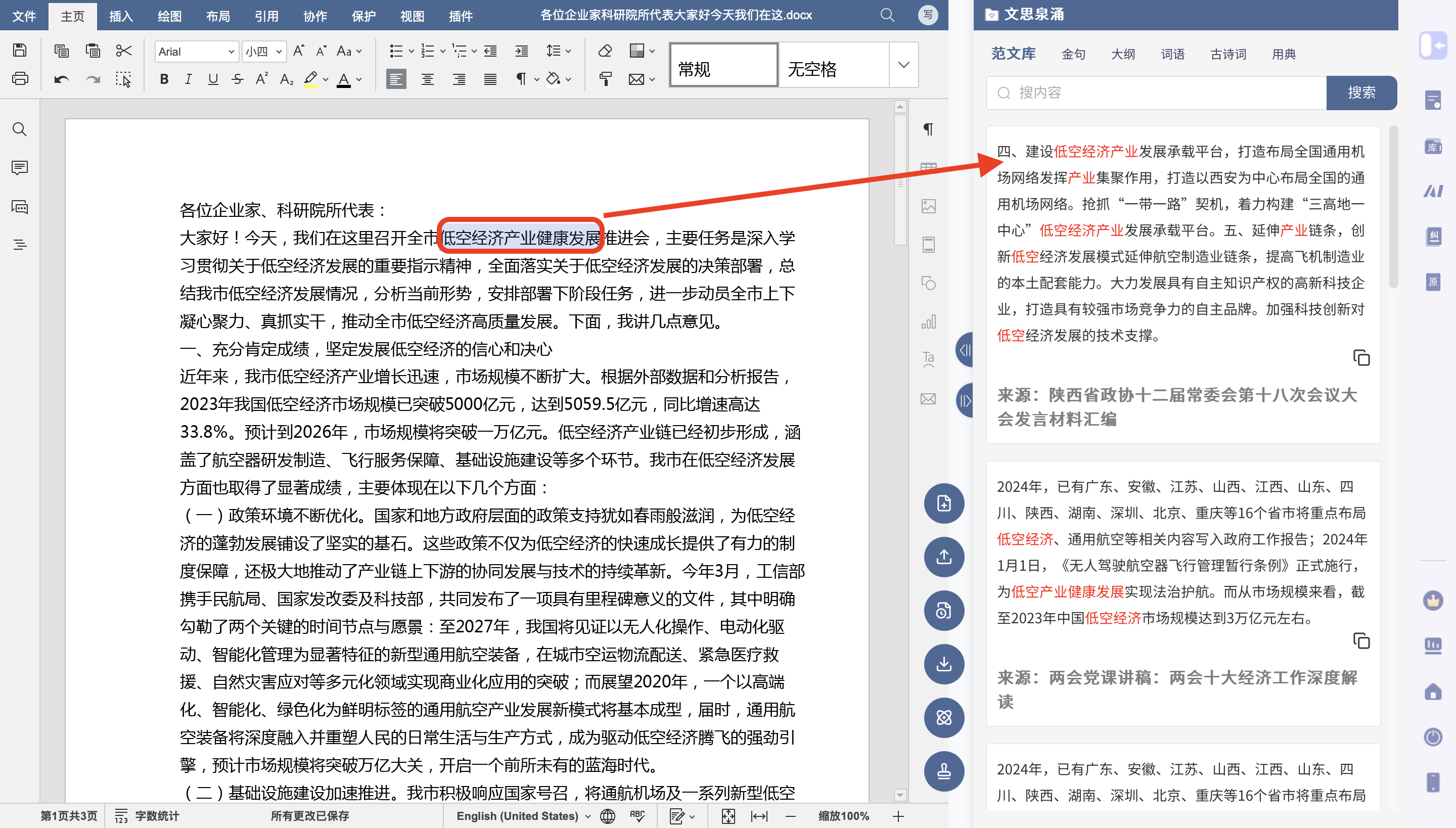 4)在导入 Office页面右侧还有独家功能「文思泉涌」,可根据勾选关键词搜索同类文章参考,巧思实用。