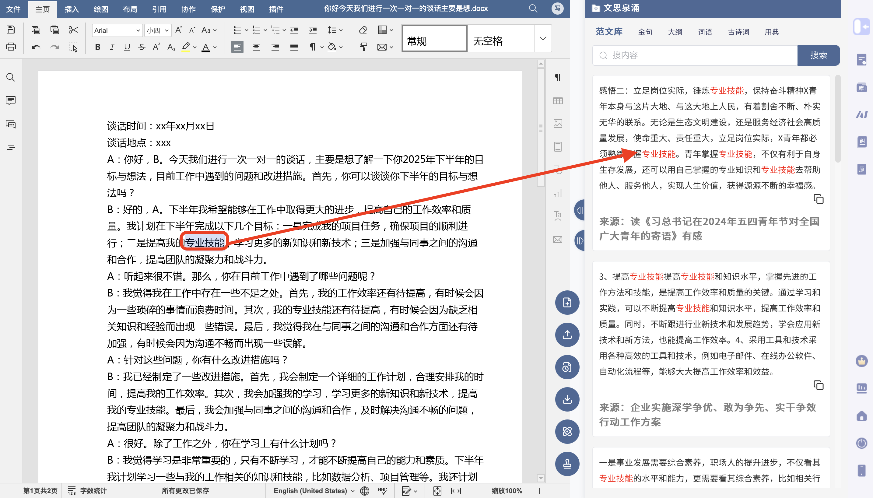 4)在导入 Office页面右侧还有独家功能「文思泉涌」,可根据勾选关键词搜索同类文章参考,巧思实用。
