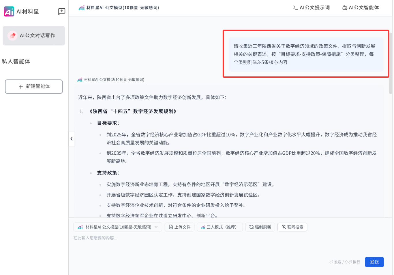 "请收集近三年我省关于数字经济领域的政策文件,提取与创新发展相关的关键表述,按'目标要求-支持政策-保障措施'分类整理,每个类别列举3-5条核心内容。"